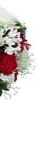 5 Red Carnations, 2 Red Gerbera, 2 White Roses, 2 White Carnations, 1 blue hydrangea, White bouvardia & Gypsophilia